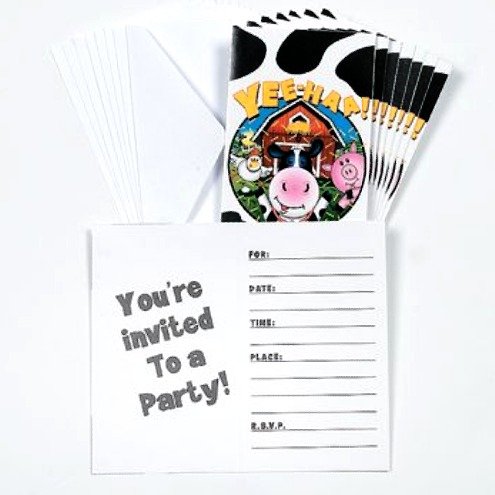 Use these adorable farm party invitations for your next farm or barnyard themed party. The card front features chickens, cows, pigs and "Yeehaa!", and inside reads "You're Invited To a Party!" (8 pcs. per set)