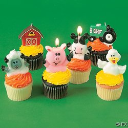 Farm Party Cake Topper Candles. Shaped like cows, sheep, pigs, chickens barns and tractors, these fun candles are an adorable way to top a cake or cupcakes for a farm or country theme party. Use them to decorate birthday party, square dance, hoedown or picnic treats!